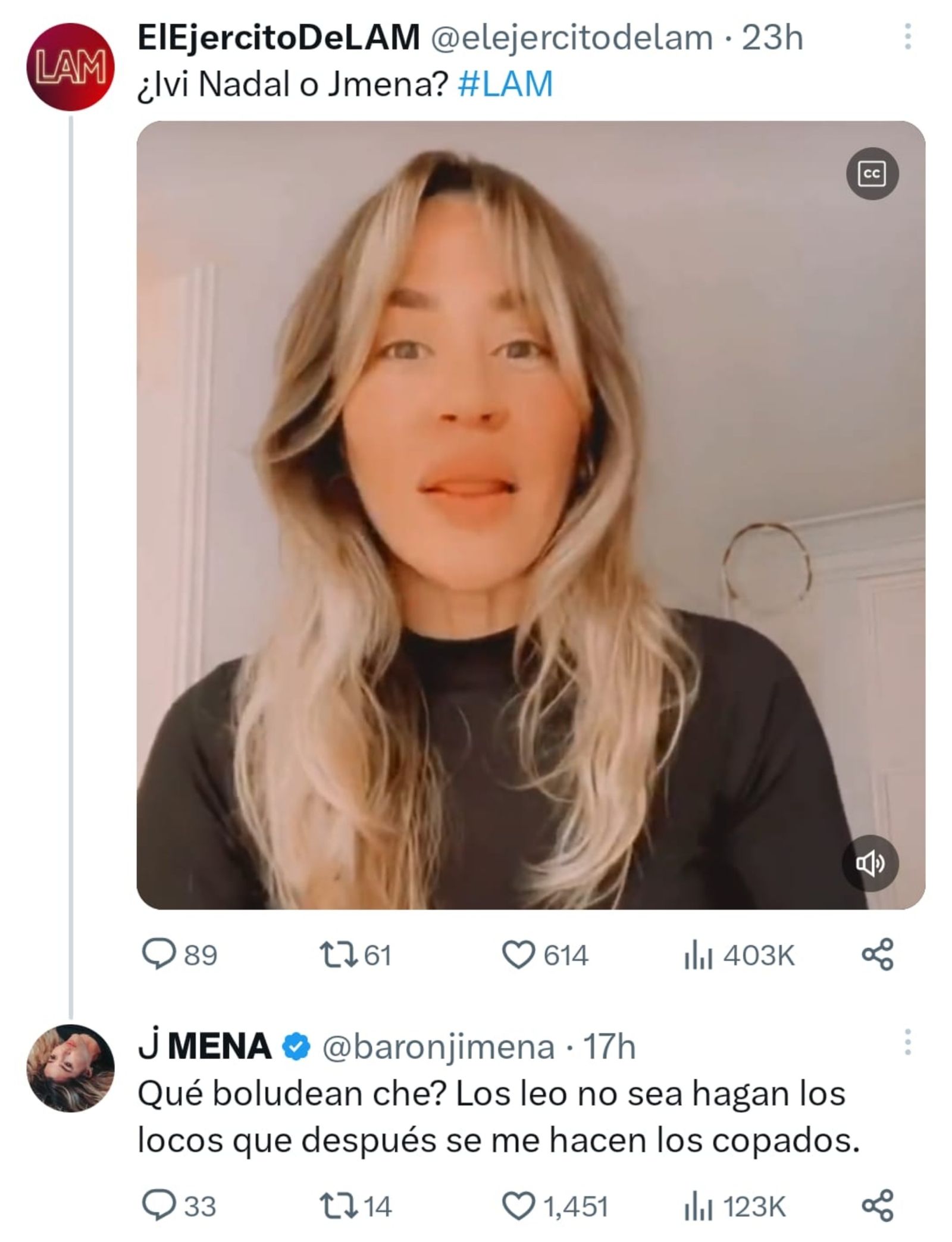 No es ninguna sorpresa que los comentarios de Ángel de Brito siempre causan polémica o peleas con celebridades. Este martes, la cuenta de Twitter (X) de LAM (@elejercitodelam), compartió un video de Jimena Barón donde reflexiona sobre la vida y el karma, bajo el título "¿Ivi Nadal o Jmena? #LAM".