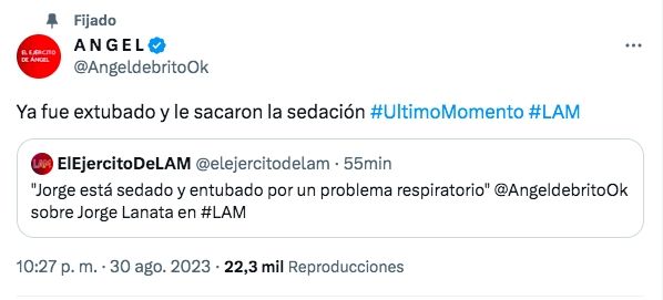 A medida que avanzaba la charla, Yanina recibió un mensaje de la esposa de Lanata confirmándole una buena noticia: "Elbita me dice que ya no está entubado ni sedado", confirmó la esposa de Diego Latorre.