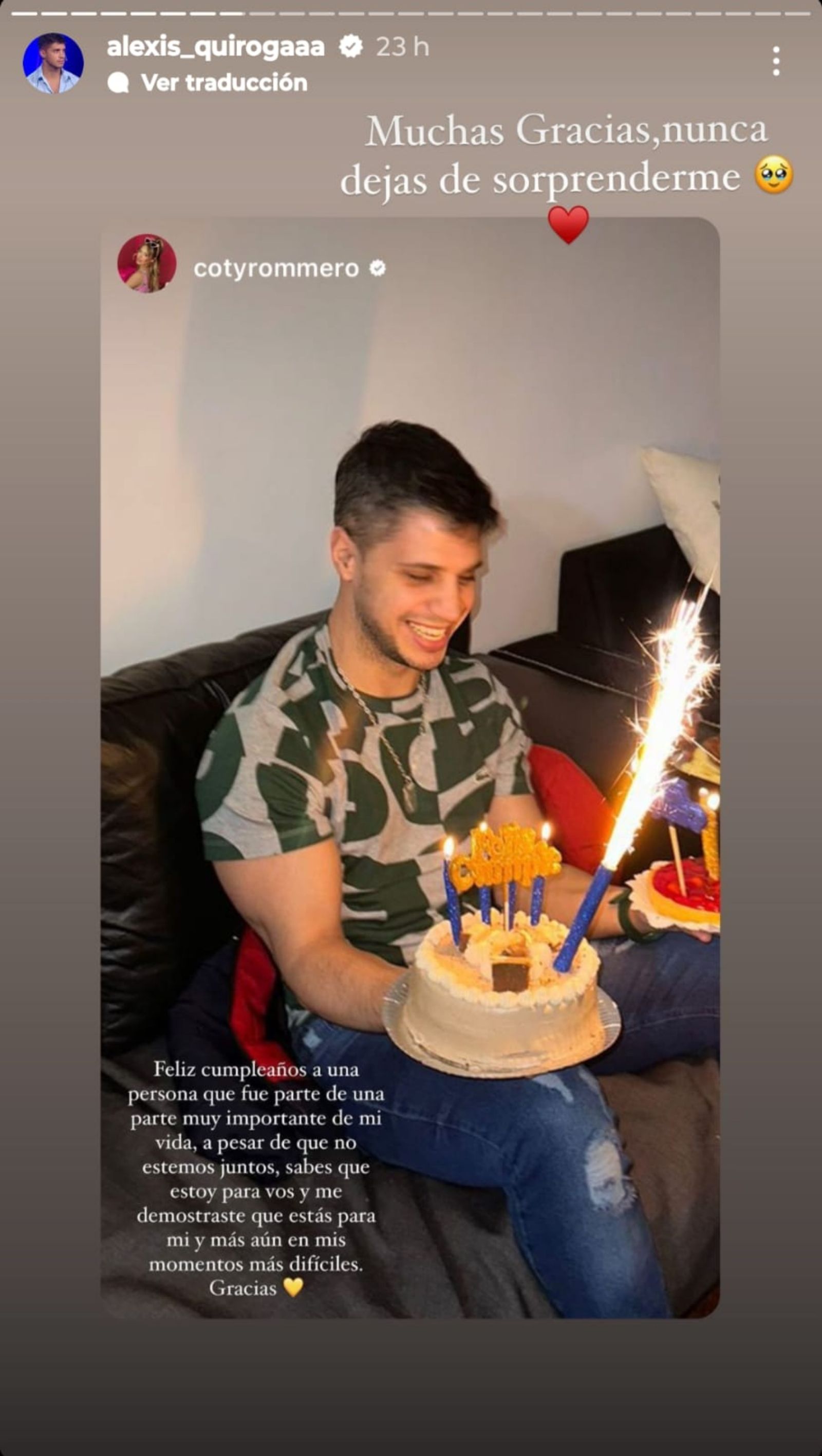 Hubo una historia de Instagram de "El Conejo" que sobresalió entre las demás: la de Coti. La joven correntina le dedicó un especial mensaje de cumpleaños a su expareja en la red social (@Cotyrommero): "Feliz cumpleaños a una persona que fue parte de una parte muy importante de mi vida, a pesar de que no estemos juntos, sabes que estoy para vos y me demostraste que estás para mí y más aún en mis momentos difíciles. Gracias".