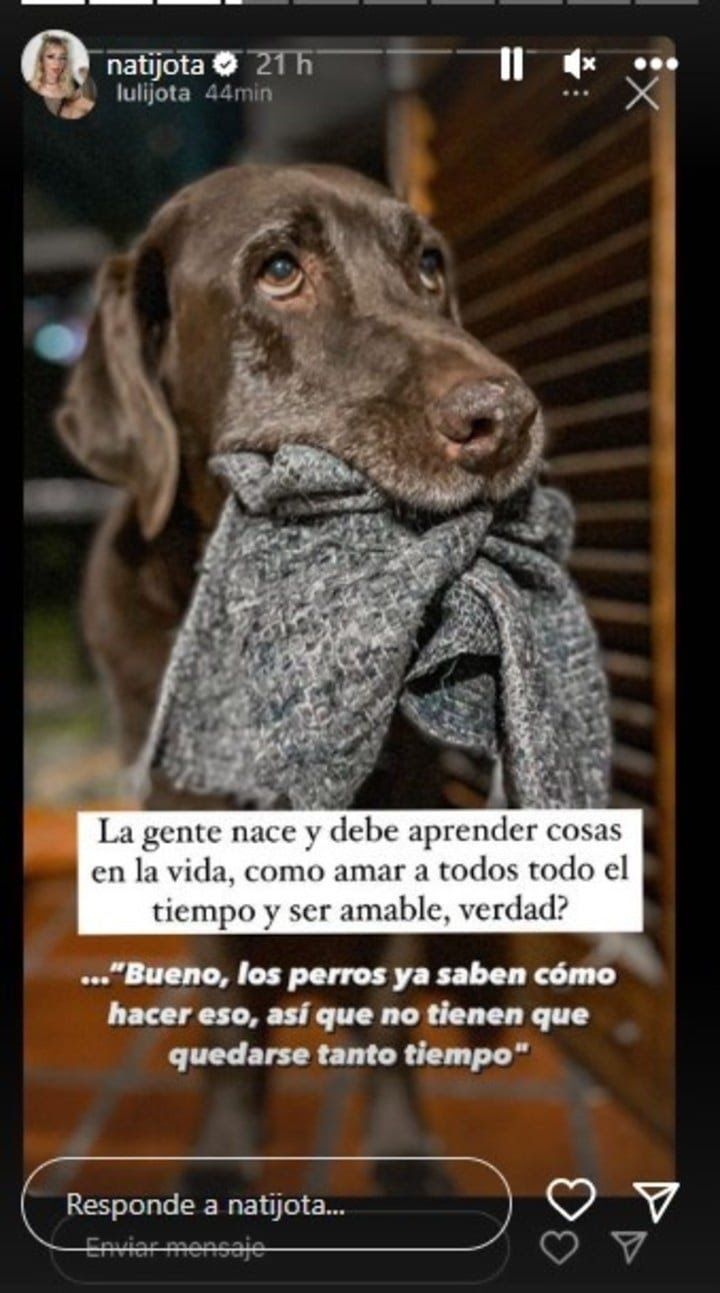 Nati Jota compartió un video en sus redes sociales para mostrar su dolor ante una dura perdida. Llorando y más triste que nunca, contó que falleció su perra, la cual se llamaba Pampa, y consideraba como parte de su familia. Además, relató el duro momento en que se enteró de su muerte.