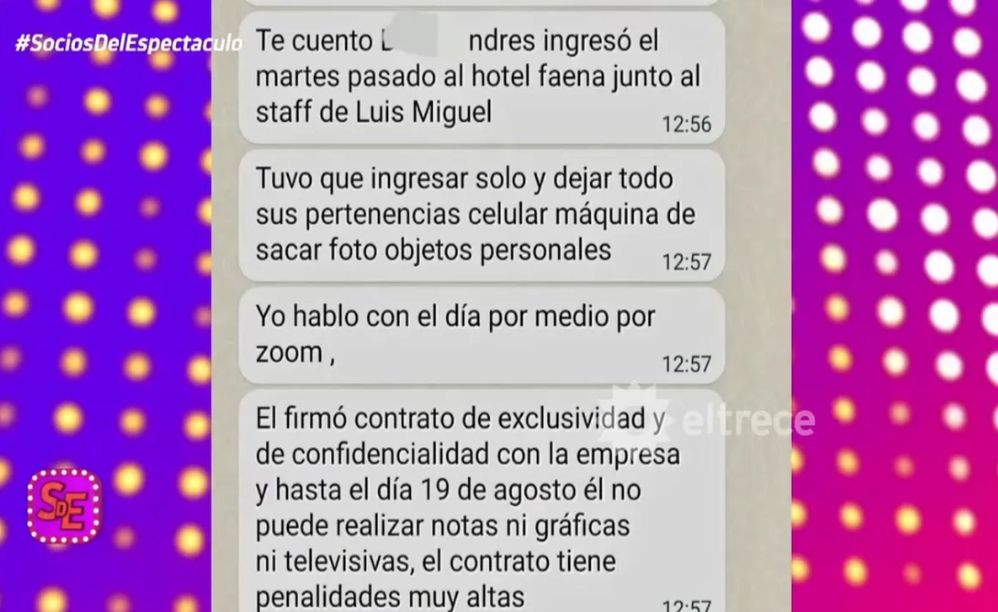 "Yo hablo con él día por medio. Él firmó un contrato de exclusividad y de confidencialidad con la empresa hasta el 19 de agosto, fecha en la que se va de Argentina Luis Miguel para cumplir con sus presentaciones", agregó.