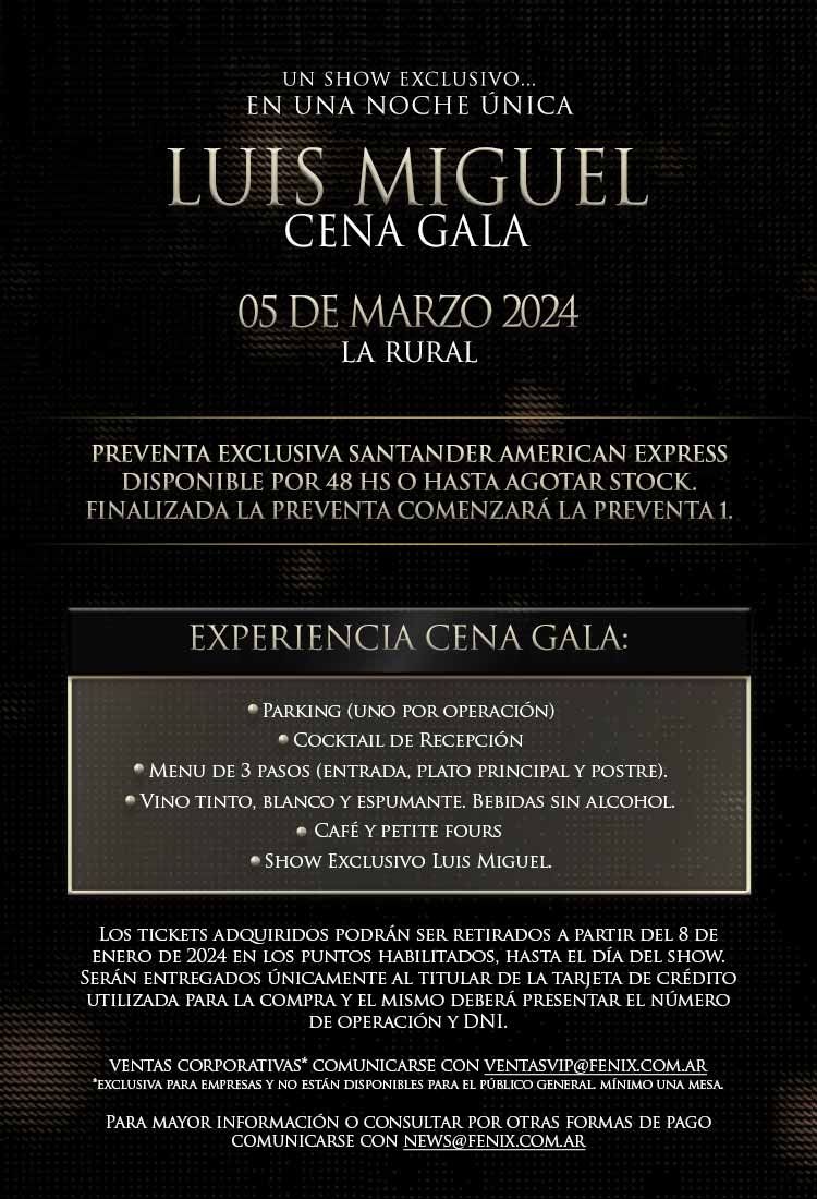 La velada incluirá, además del show de Luis Miguel, cocktail de recepción, menú de 3 pasos y estacionamiento. La preventa comenzó este lunes 11 de septiembre a las 12 del mediodía por 48 hs o hasta agotar stock. Las entradas se pueden conseguir por www.entradauno.com.