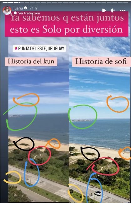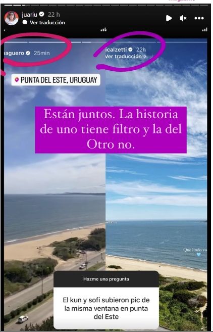 ¿Qué pasó? La investigadora de los famosos en Instagram capturó las stories que postearon ambos, que coinciden casi perfectamente en un paisaje de una playa, como sacado desde el mismo ángulo, es decir del balcón de una habitación de un hotel de lujo de Punta del Este.