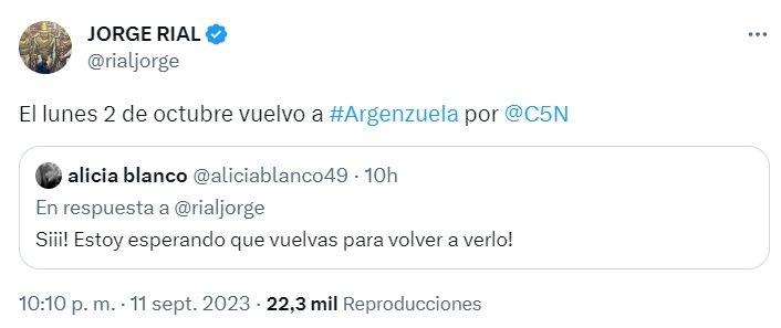 Sin embargo, Jorge Rial negó que su labor en Argenzuela haya terminado y, en noche del lunes 11 de septiembre, anunció que su vuelta a la pantalla de C5N ya tiene fecha fijada: a inicios de octubre.