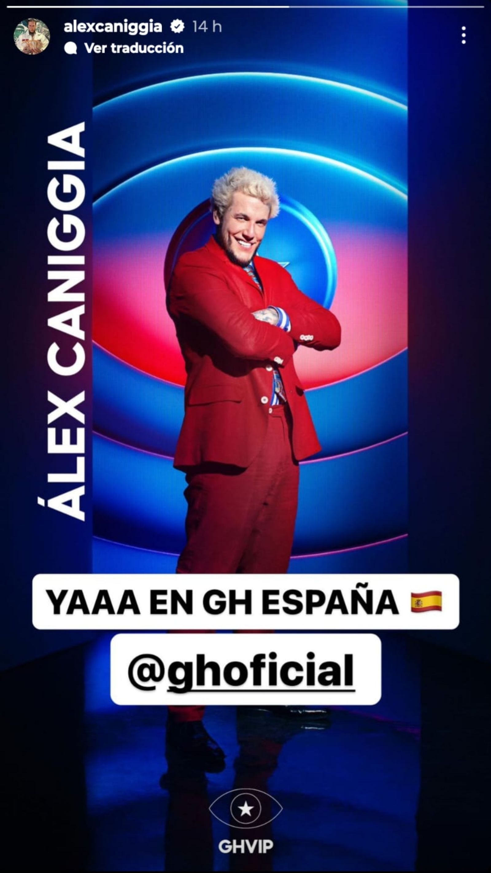 "El emperador" compite contra 17 participantes, entre ellos está Sol Macaluso, periodista argentina. El influencer hizo su anuncio a través de sus redes sociales (@Alexcaniggia). En su presentación, dejó en claro la mala relación que tiene con sus padres, el buen vínculo con Charlotte Caniggia, su hermana; y su vida como padre.