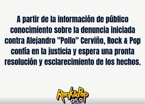 "A partir de la información de público conocimiento sobre la denuncia iniciada contra Alejandro "Pollo" Cerviño, Rock & Pop confía en la justicia y espera una pronta resolución y esclarecimiento de los hechos", compartieron en sus redes sociales, justificando los motivos del alejamiento de Cerviño al frente de los programas Llave en mano y Ranking Rock & Pop.