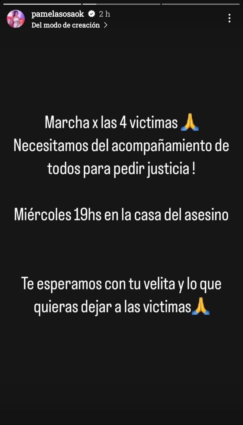 “El slogan es ‘necesitamos el acompañamiento de todos para pedir Justicia’. Va a ser el próximo miércoles a las 19 horas en la casa de Aníbal Lotocki. Te esperamos con una velita para pedir por las víctimas”, agregó.