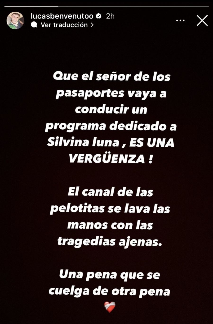 “¡Que el señor de los pasaportes vaya a conducir un programa dedicado a Silvina Luna es una vergüenza! El canal de las pelotitas se lava las manos con las tragedias ajenas. Una pena que se cuelga de otra pena”, escribió en su Instagram, recordando que el conductor de 53 años fue apuntado semanas atrás por una causa de abuso sexual.