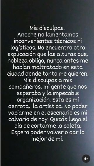"No me gusta dar excusas pero no son problemas de salud, ni de logística, ni organización, ni nada musical arriba del escenario. Gracias por preocuparse, no es nada. Para mí dar un recital flojo es una pequeña tragedia personal, de vergüenza torera", concluyó.