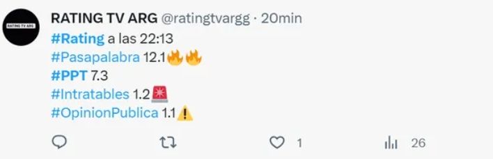 A las 22.13, Pasapalabra redondeaba los 12.1 puntos, mientras que Periodismo para todos lograba 7.3 puntos. Muy atrás, aparecían Intratables (América), con 1.2 puntos y Opinión Pública (El Nueve), con 1.1.
