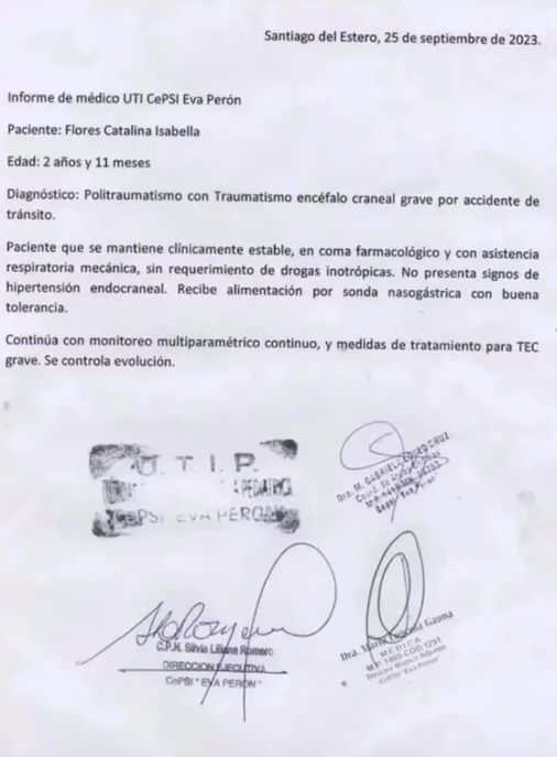 El último parte médico indica que la menor "sufrió un traumatismo encéfalo craneal grave". Dentro de esta situación, la paciente "se mantiene clínicamente estable, en coma farmacológico y con asistencia respiratoria mecánica, sin requerimiento de drogas inotrópicas", de acuerdo a lo detallado por los profesionales del Centro Provincial de Salud Infantil (CEPSI) de Santiago Del Estero donde permanece internada desde la noche del miércoles.