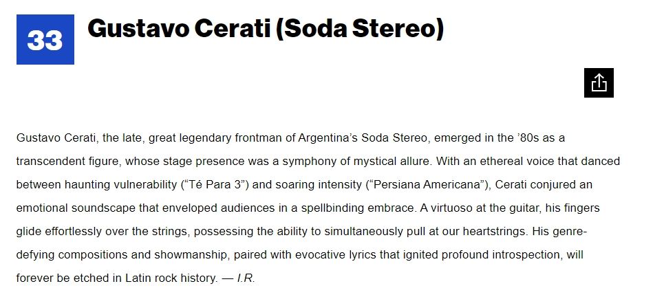 Sobre la inclusión de Cerati en este listado, escribe Isabel Raygoza: "El gran líder de la banda argentina Soda Stereo, emergió en los años 80 como una figura trascendente cuya presencia en el escenario combinaba encanto y mística. Con una voz etérea, que bailaba entre la inquietante vulnerabilidad ("Té para 3") y la altísima intensidad ("Persiana americana"), Cerati conjuró un emotivo paisaje sonoro que envolvió al público en un abrazo fascinante", expresó la periodista.