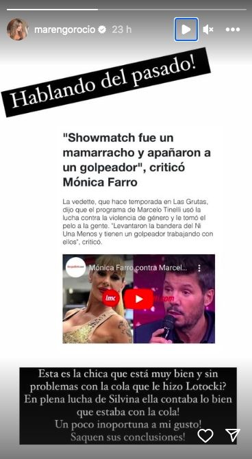 Además, Marengo cuestionó a Mónica Farro por sus polémicas declaraciones en una entrevista. "¿Esta es la chica que está muy bien y sin problemas con la cola que le hizo Lotocki? En plena lucha de Silvina Luna, ella contaba lo bien que estaba con la cola. Un poco inoportuna a mi gusto. Saquen sus conclusiones", lanzó.