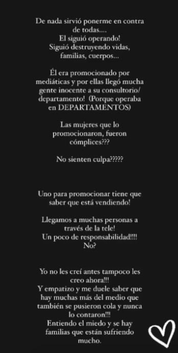 "De nada sirvió ponerme en contra de todas, él siguió operando. Siguió destruyendo vidas, familias, cuerpos. Él era promocionado por mediáticas y por ellas llegó mucha gente inocente a su consultorio/departamento, (Porque operaba en departamentos)", compartió la mediática.