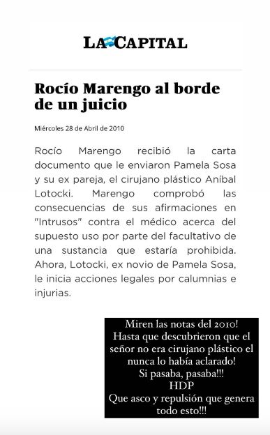 "Miren las notas del 2010. Hasta que descubrieron que el señor no era cirujano plástico... él nunca lo había aclarado Si pasaba, pasaba! HDP. Qué asco y repulsión que genero todo esto", reflexionó.