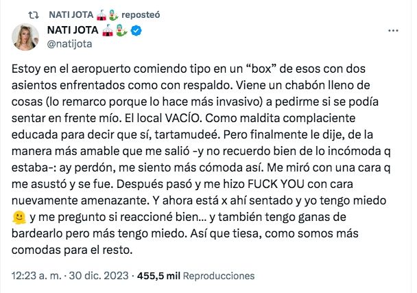 Fue a través de su cuenta de X donde contó lo sucedido: "Estoy en el aeropuerto comiendo tipo en un ‘box’ de esos con dos asientos enfrentados como con respaldo. Viene un chabón lleno de cosas (lo remarco porque lo hace más invasivo) a pedirme si se podía sentar en frente mío. El local estaba vacío", comenzó expresando.