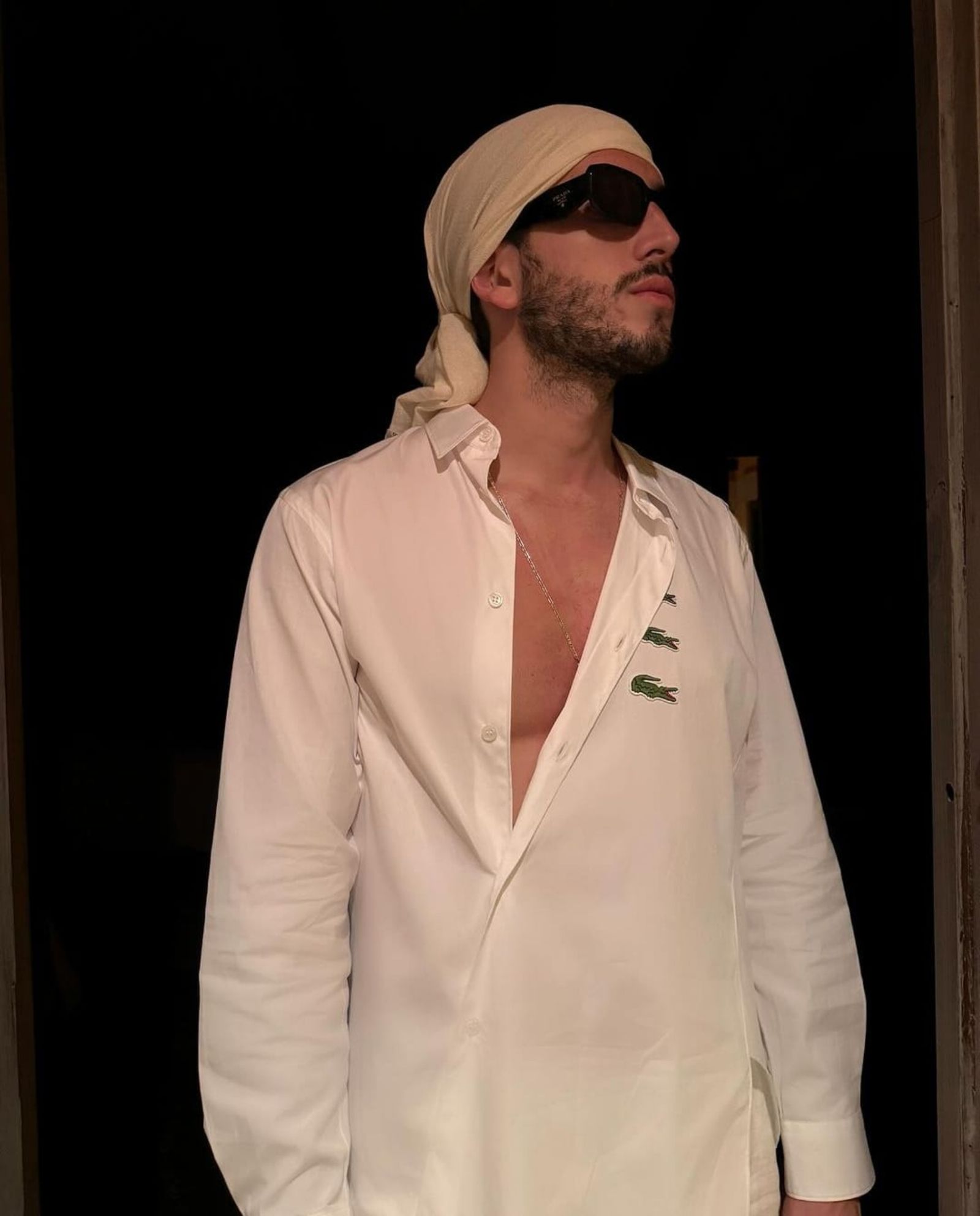 El artista eligió un outfit todo blanco para darle la bienvenida al nuevo año, con una camisa manga larga de Lacoste, un pantalón de lino. Este look lo complementó con un pañuelo en su cabeza y unas gafas negras.