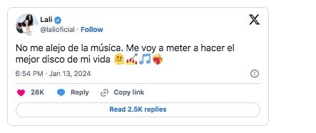 De ese modo, Lali agarró su celular y puso con mucha claridad e ímpetu: “No me alejo de la música. Me voy a meter a hacer el mejor disco de mi vida". Así, la morocha dejó asentado que todo se remonta a dedicarse un tiempo para crear su nueva placa.