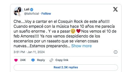 En definitiva, hace unos días la famosa escribió un posteo en su cuenta oficial de Twitter que rezaba: "Che... voy a cantar en el Cosquín Rock de este año! Cuando empecé con la música hace 10 años me parecía un sueño enorme. Y va a pasar. Nos vemos el 10 de febrero, amores!”.