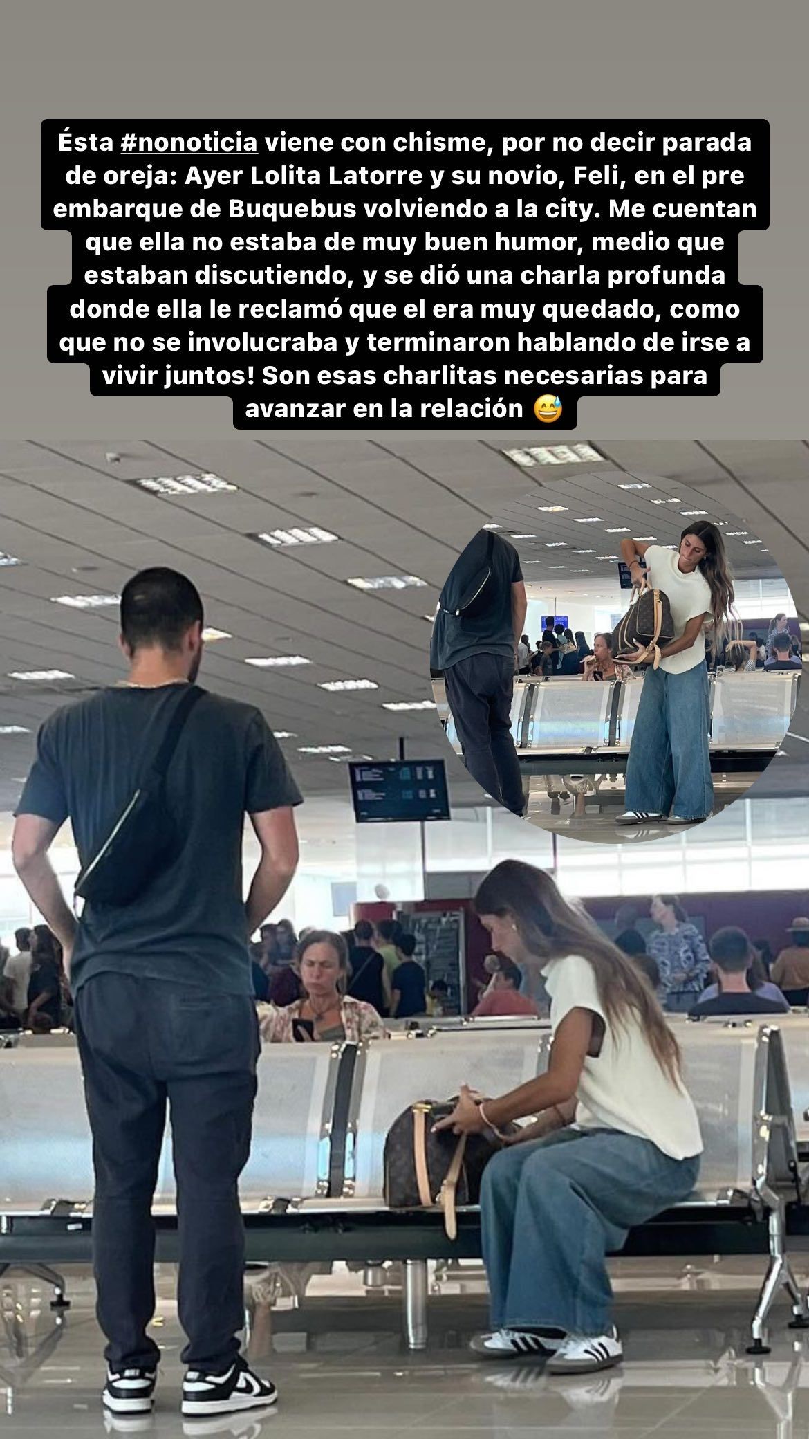 "Lolita Latorre y su novio, Feli, en el pre embarque del Buquebus volviendo a la city. Me cuentan que ella no estaba de muy buen humor, medio que estaban discutiendo", comenzó informando desde sus redes sociales la periodista Marcia Frisciotti.