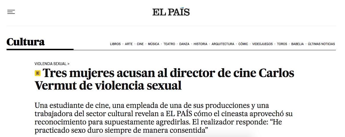 Primero fue el caso de Vermut, responsable de filmes como Mantícora y Magic Girl, denunciado a partir de una investigación del diario El País que puso el foco en hechos ocurridos entre 2014 y 2022 y que involucran a una estudiante de cine, a una empleada de una de sus producciones y a otra trabajadora del sector cultural.