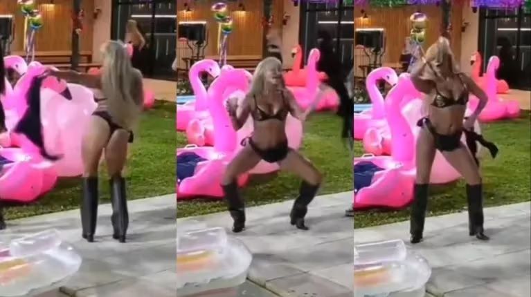 La veterana mujer de 65 años bailó luciendo una microbikini negra y botas de caña alta del mismo color, cerca de la zona de la pileta, completamente desaforada con su baile como si nadie la estuviera mirando. Como si las cámaras no la estuviesen enfocando.
