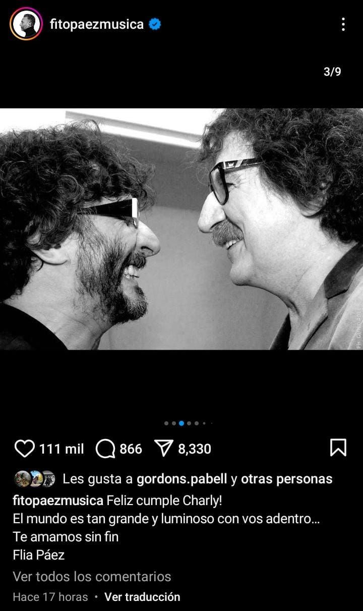 Uno de los primeros en dejarle su saludo fue por supuesto Fito Paéz, antiguo compañero de banda y amigo desde allí. En su cuenta de Instagram le dejó un bellísimo mensaje, acompañado de fotos de distintas etapas de su amistad. “Feliz cumple Charly! El mundo es tan grande y luminoso con vos adentro…Te amamos sin fin” escribió el rosarino.