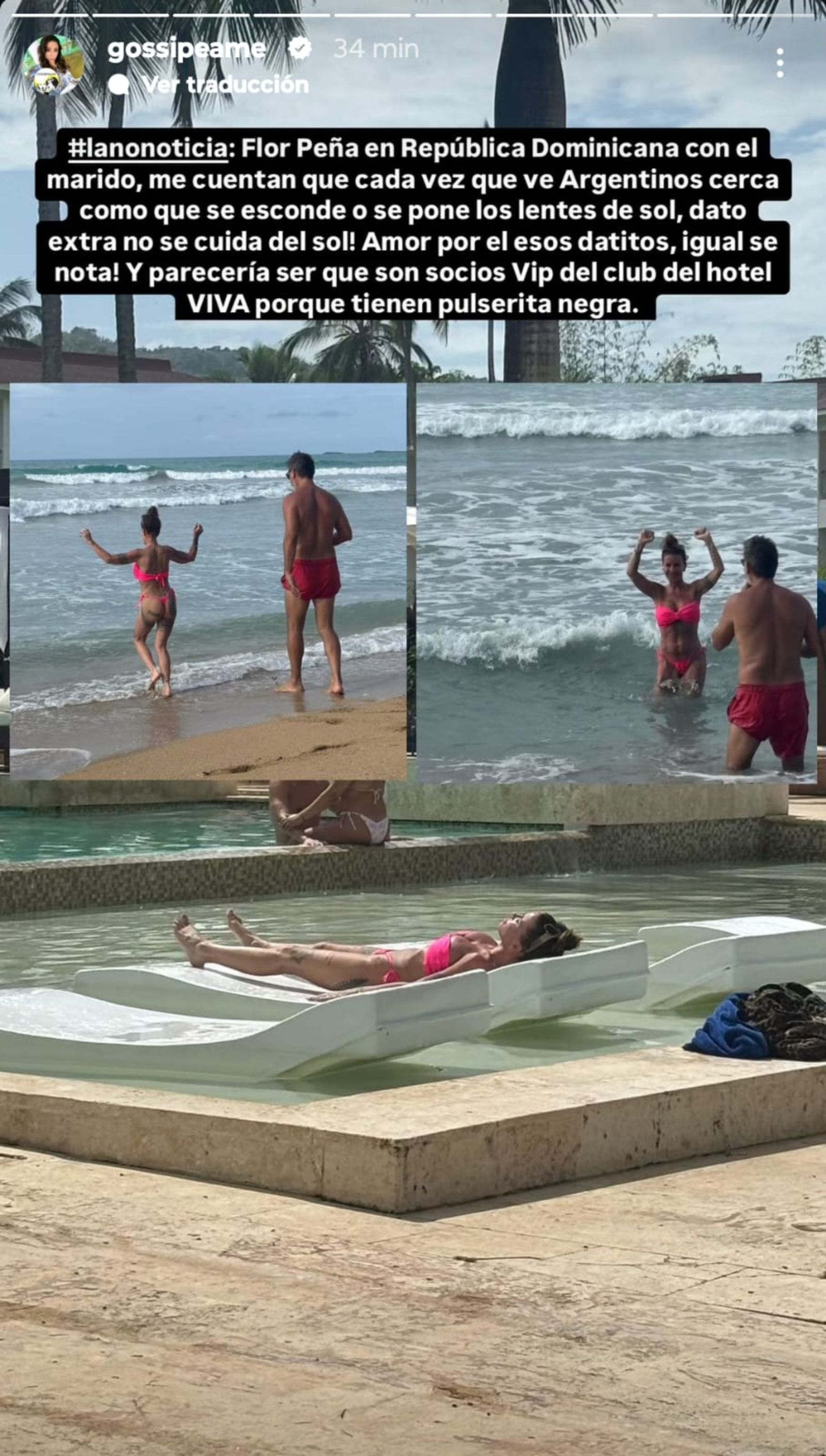 "#Lanonoticia: Flor Peña en República Dominicana con el marido", dice la primera parte de la historia. Luego, reveló: "Me cuentan que cada vez que ve argentinos cerca como que se esconde o se pone los lentes de sol. Dato extra, ¡no se cuida del sol! ¡Amor por esos datitos, igual se nota!".