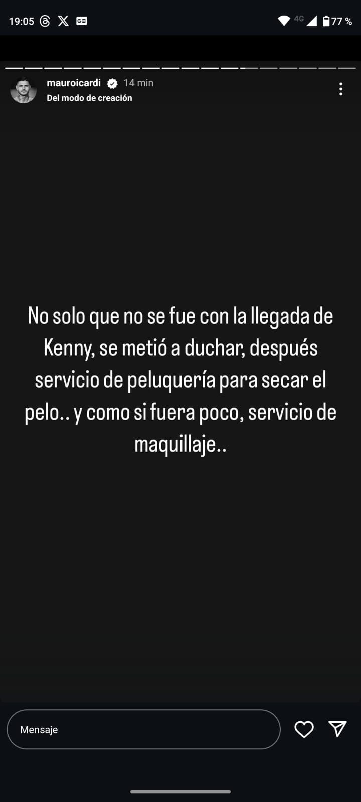 En una historia también compartió que "no solo que no se fue con la llegada de Kenny, se metió a duchar, después servicio de peluqería para secar el pelo... y como si fuera poco, servicio de maquillaje". Lo cierto es que la tensión que se veía en el video era realmente verdadera.