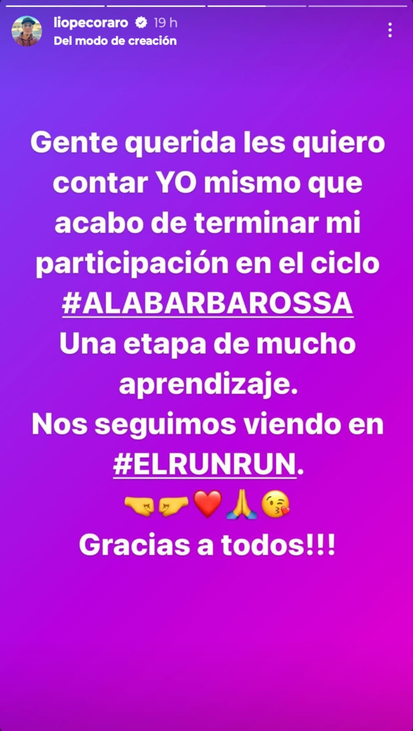 Se trata de Lío Pecoraro, quien actualmente se desempeña como panelista en A la Barbarossa. A través de sus historias de Instagram (@Liopecoraro), el pasado miércoles 27 de noviembre el comunicador aclaró: "Gente querida les quiero contar YO mismo que acabo de terminar mi participación en el ciclo #ALABARBAROSSA. Una etapa de mucho aprendizaje. Nos seguimos viendo en #ELRUNRUN. ¡¡¡Gracias a todos!!!".
