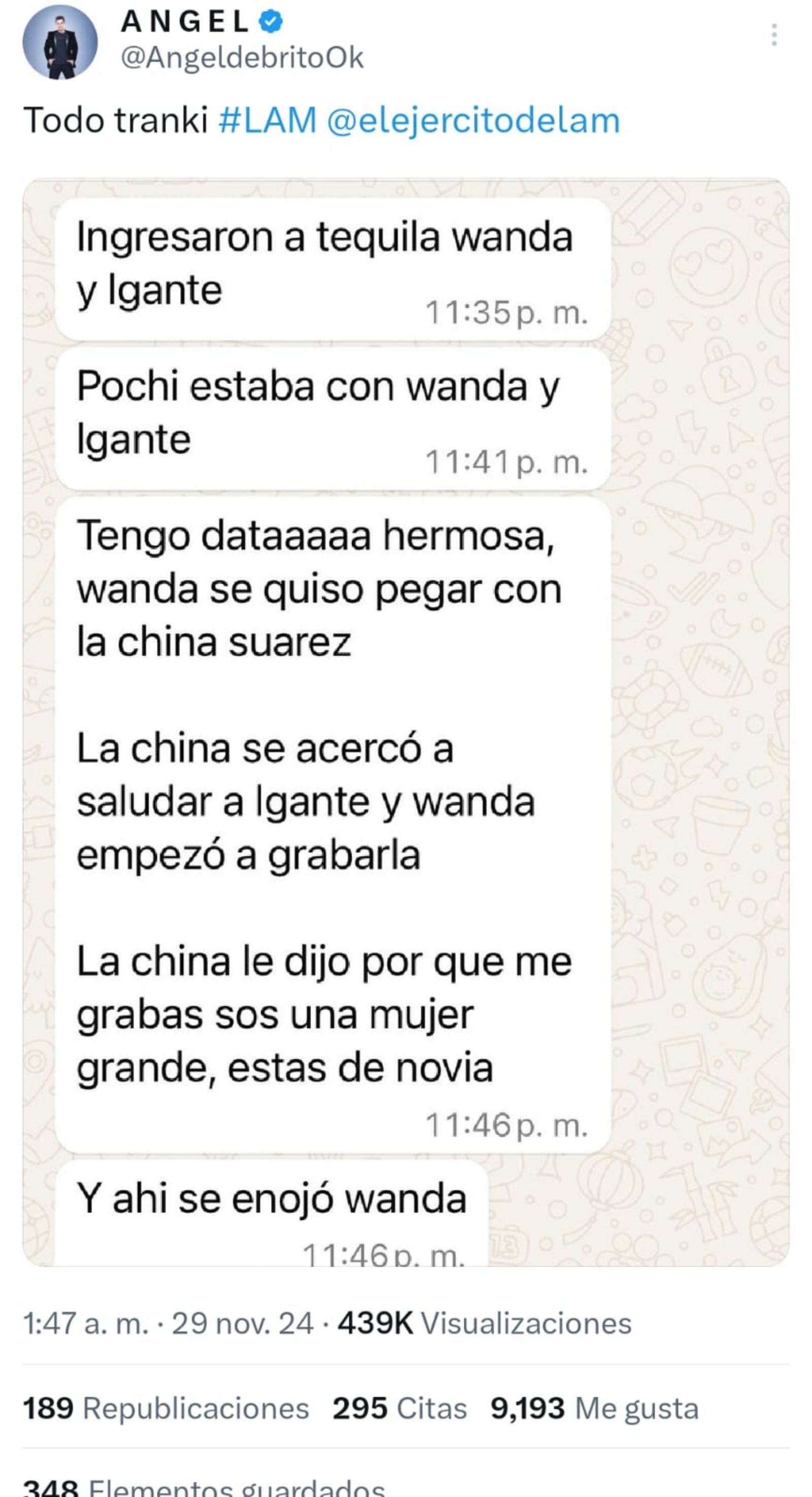 "Ingresaron a Tequila, Wanda y L-Gante. Pochi estaba con Wanda y L-Gante. Tengo dataaaaa hermosa, Wanda se quiso pegar con 'La China' Suárez. 'La China' le dijo '¿por qué me grabas? Sos una mujer grande, estás de novia'. Y ahí se enojó Wanda", dice la conversación que compartió de Brito.