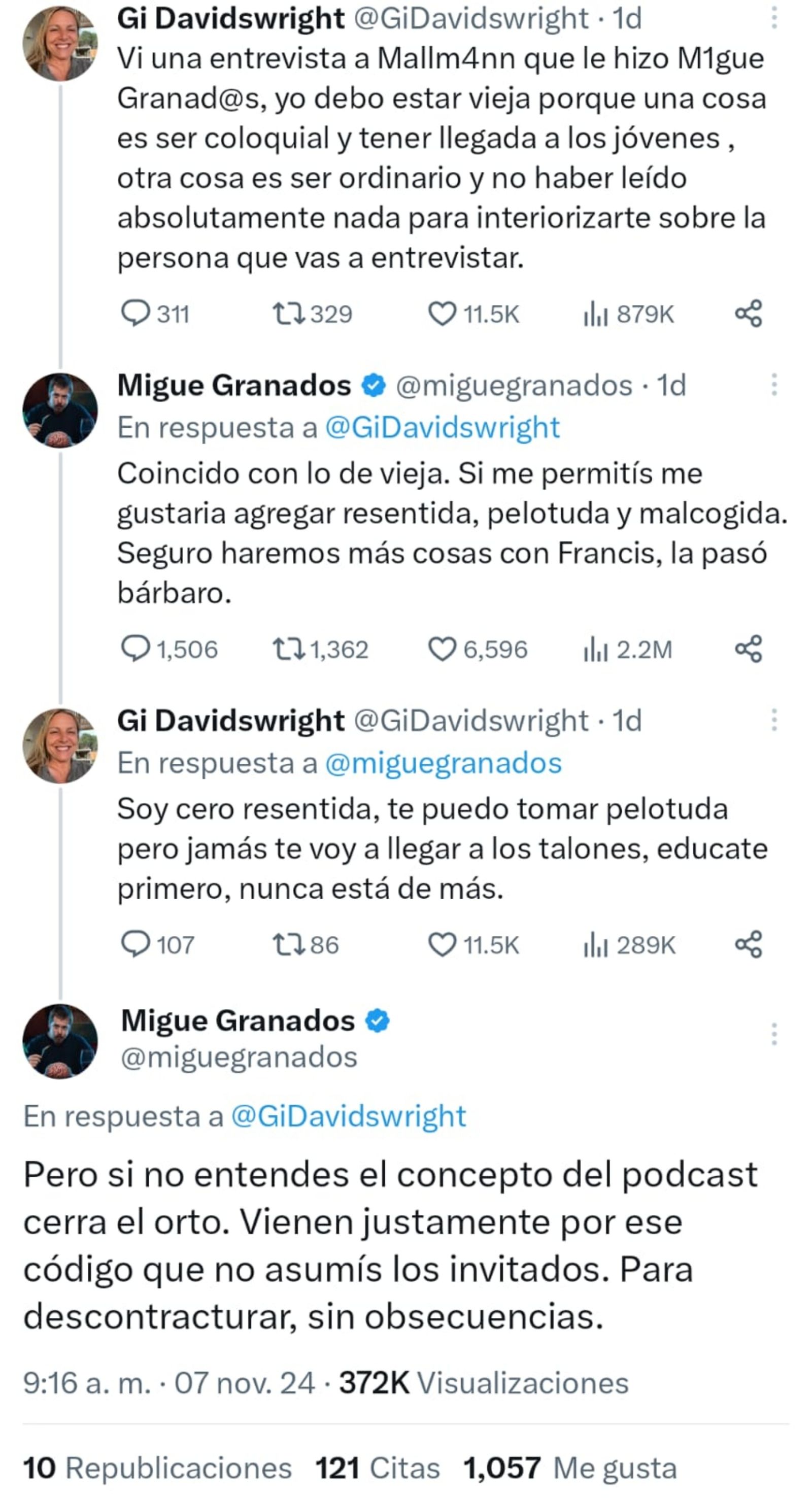 "Encima la manera de responder da cuenta de lo vulgar y ordinario que es, en algún momento lo van a cancelar como hacen con todos y va a salir pidiendo perdón para limpiar la 'imagen'"; "No da para insultar de ninguna parte ,dicho esto creo que a Miguel le pasa lo de un nene caprichoso, quiere que todo el tiempo le digan que es un genio y hace todo bien, la primera que lo critican se enoja. Por eso actúa como un nene caprichoso e irrespetuoso"; "Qué tipo maleducado", son algunos de los comentarios que circulan en X sobre las réplicas de Granados.
