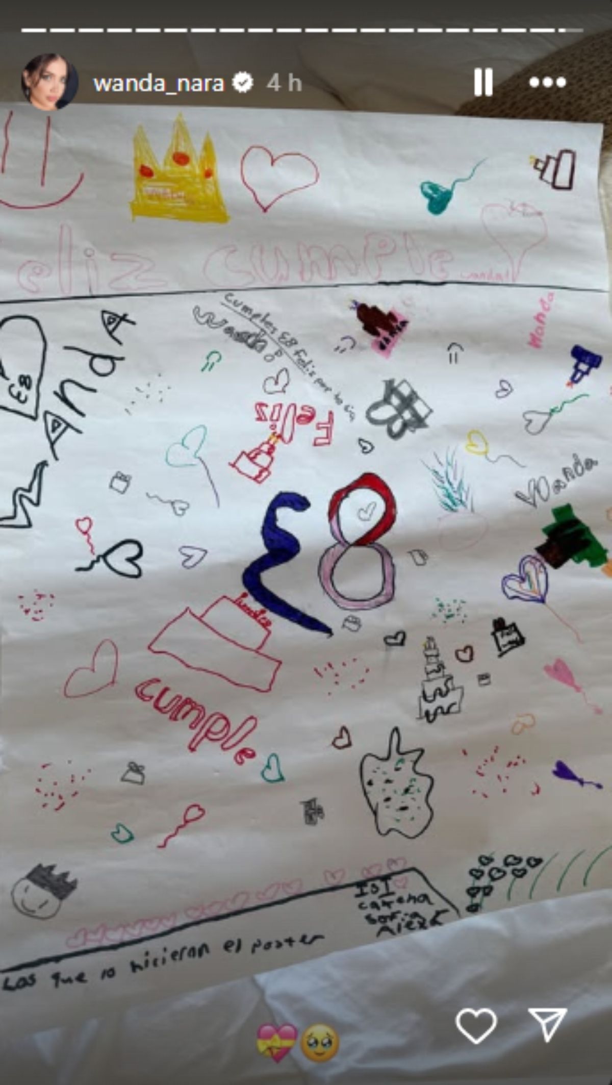 Este no fue el único regalo emocionante que recibió Wanda Nara en su cumpleaños. En una siguiente historia de Instagram, la conductora de televisión compartió una parte del segundo regalo que le dieron sus hijos para su día. En la imagen, se puede ver un divertido dibujo a mano, con el número 38 en el centro en referencia a la nueva edad de la modelo.