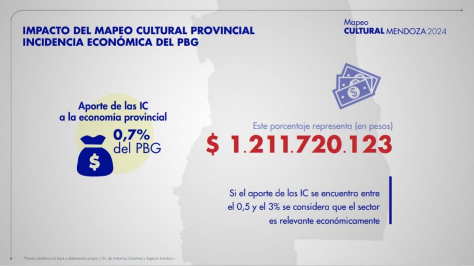 Por el lado económico, Ladrón de Guevara contó que un dato que no se había calculado nunca es el impacto que tiene la cultura sobre la economía provincial. "Nosotros fuimos haciendo el cálculo según el producto geográfico de cada departamento y hay departamentos que están por encima y otros por debajo del valor que arrojó el mapeo. Pero hay un indicador general que se calcula con otro indicador llamado cuenta satélite de la cultura que dice que si este indicador esta entre 0,5 % y 3 % es un sector relevante para la economía. El indicador que obtuvimos para el sector cultural fue de 0,7 %. Es decir, es un sector que se considera relevante para la economía".