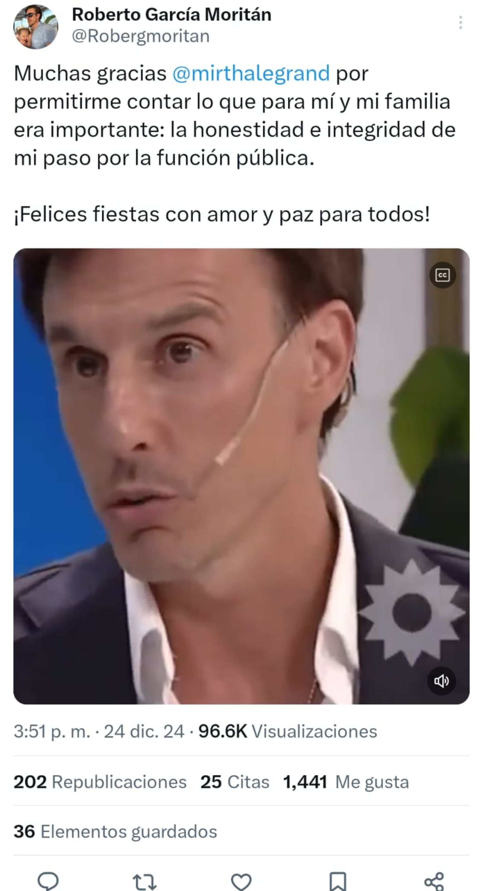 "Muchas gracias @mirthalegrand por permitirme contar lo que para mí y mi familia era importante: la honestidad e integridad de mi paso por la función pública. ¡Felices fiestas con amor y paz para todos!", expresó el empresario.