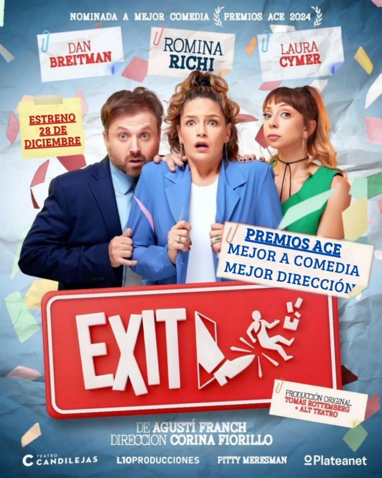 "Exit" cuenta en Carlos Paz con la producción de L10 Producciones y Pitty Meresman. Las funciones son de martes a domingo a las 22:30 horas, “Exit” se perfila como uno de los éxitos del verano en las sierras cordobesas. Las entradas ya están disponibles en Planetanet.com, en la boletería del teatro y en 9 de Julio 31. Una comedia apta para toda la familia que asegura 80 minutos de risas y diversión sin pausa.