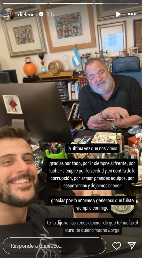 Quien también realizó una sentida publicación fue Diego Leuco. El periodista expresó en sus redes sociales el profundo dolor que siente: "La última vez que nos vimos. Gracias por todo, por ir siempre al frente, por luchar siempre por la verdad y en contra de la corrupción".