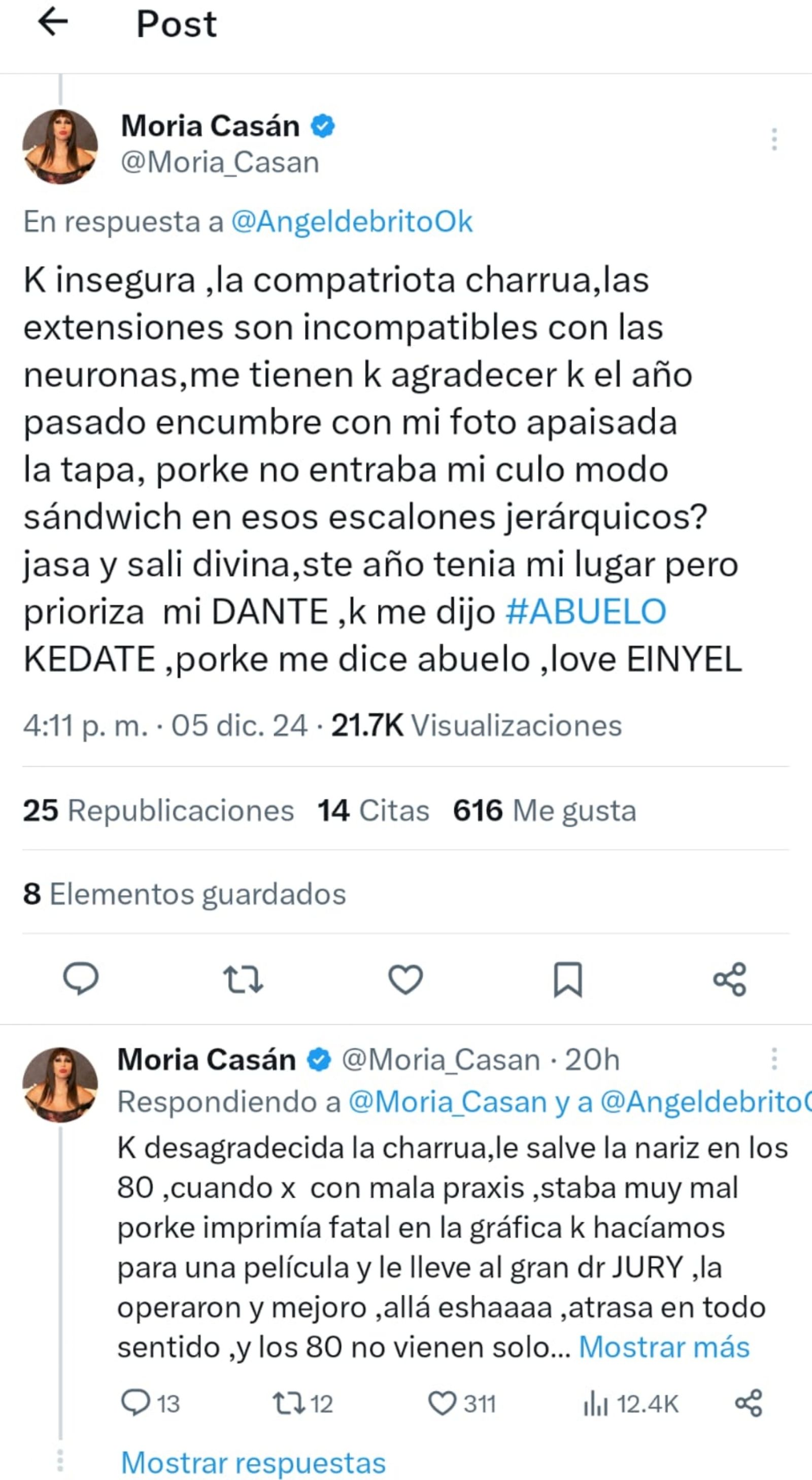 "Qué insegura, la compatriota charrúa, las extensiones son incompatibles con las neuronas, me tienen que agradecer que el año pasado encumbre con mi foto apaisada la tapa, porque no entraba mi cul* modo sándwich en esos escalones jerárquicos? Jasa y salí divina, este año tenia mi lugar pero prioriza mi DANTE ,que me dijo #ABUELO KEDATE, porque me dice abuelo, love EINYEL", replicó la actriz.