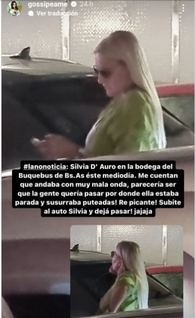 La cuenta Gossipeame consiguió un material fotográfico que prueba que Silvia entró a Argentina proveniente de Uruguay, a bordo de un Buquebus. Por eso ese perfil digital contó: "Silvia en la bodega de Buquebus de Buenos Aires este mediodía. Me cuentan que andaba con muy mala onda, parecería ser que la gente quería pasar por donde ella estaba parada y susurraba puteadas. Re picante. ¡Subite al auto, Silvia, y dejá pasar!".