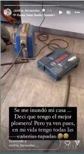Acto seguido, Cinthia valoró la capacidad del hombre que llevó el instrumental idóneo para alivianar los desagües y narró con total honestidad y empatía: “Decí que tengo al mejor plomero, pero ya ven pues, en mi vida tengo todas las cañerías tapadas”. Además le agregó una pizca de humor al añadirle una música graciosa y un par de emojis.