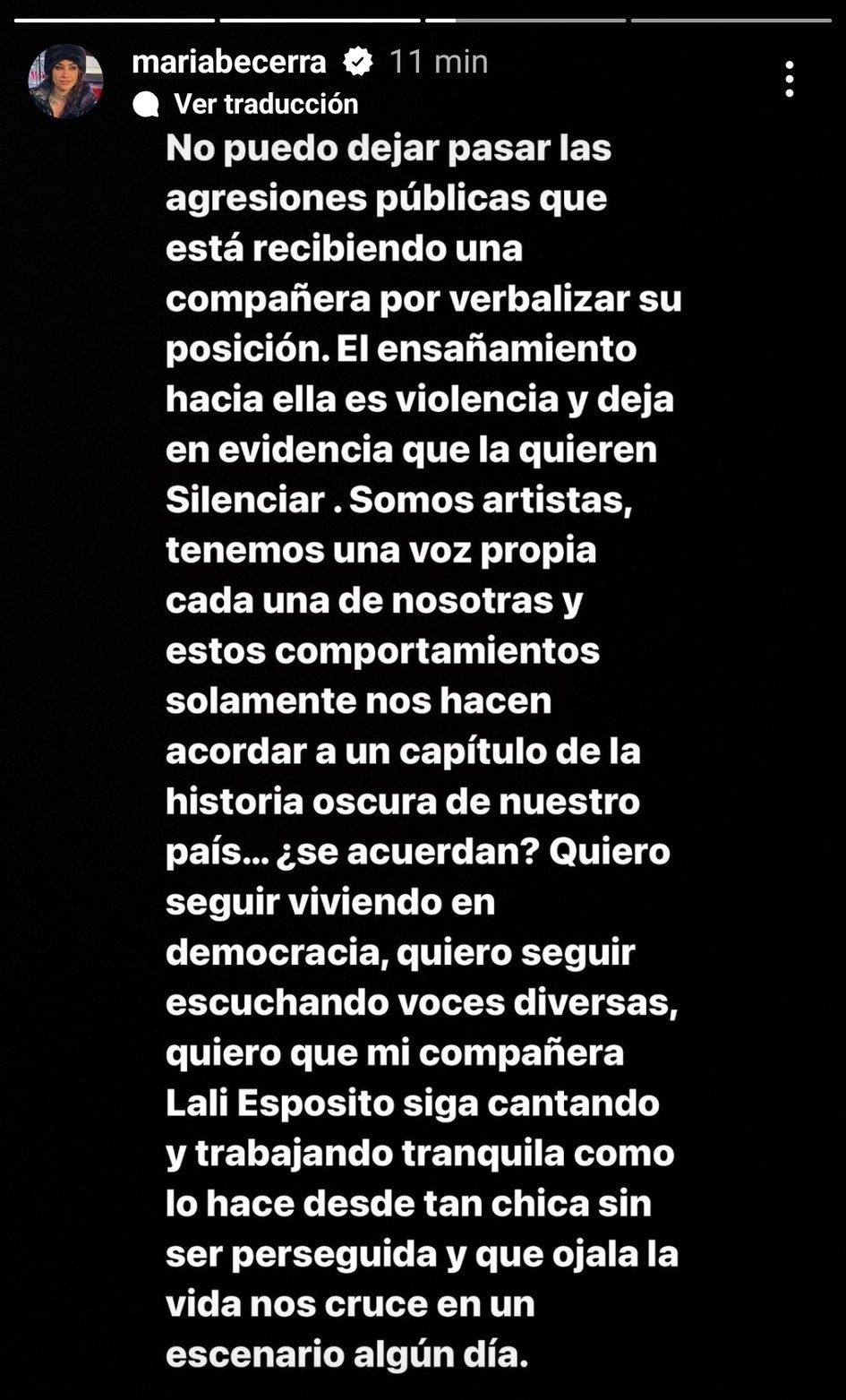 Las redes se mostraron revolucionadas por esta embestida del presidente y por esto varios artistas salieron a mostrarle su apoyo a Lali Espósito. Uno de los nombres que más se escuchó en las últimas horas fue el de María Becerra, quien expresó: "No se puede creer esto. Obvio que voy a salir a bancar a mi colega Lali Espósito".