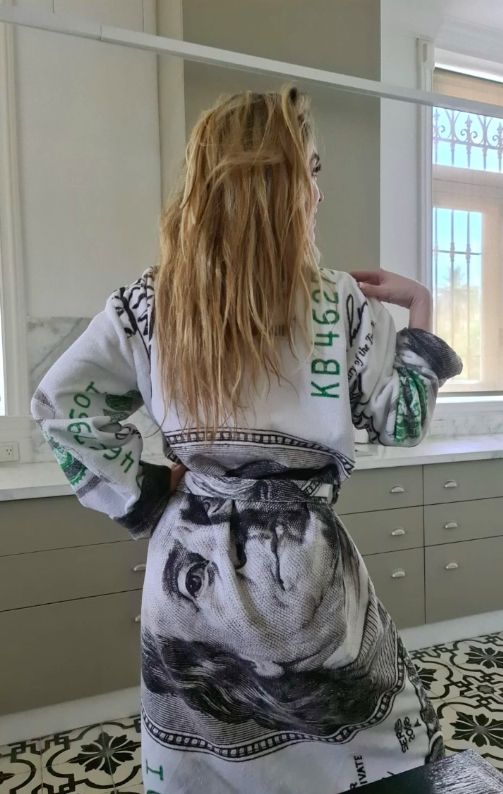 En una de sus últimas publicaciones de Instagram, la humorista posó luciendo una bata estampada con el billete de 100 dólares.