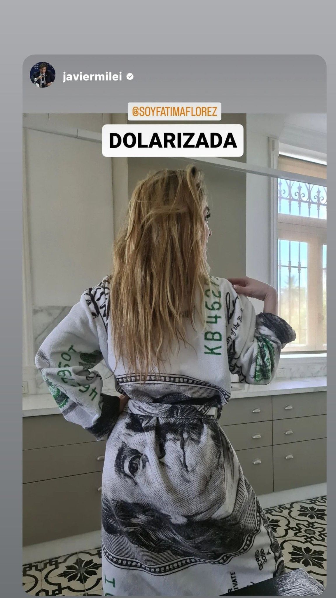 Al verla, el presidente de la nación no tardó tiempo en compartir la imagen en sus redes sociales oficiales, sumándole el comentario "Dolarizada".