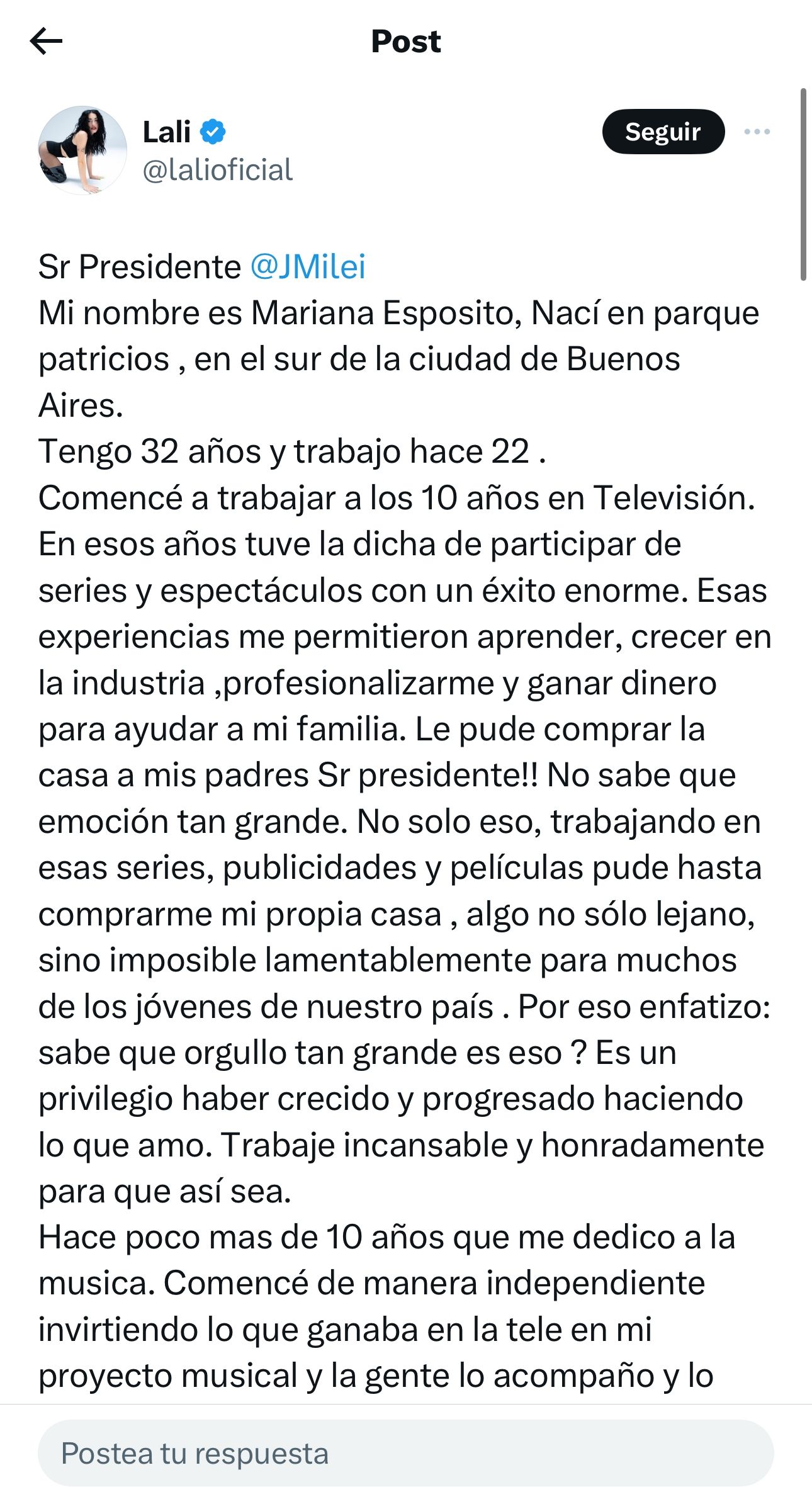“Esas experiencias me permitieron aprender, crecer en la industria ,profesionalizarme y ganar dinero para ayudar a mi familia. Le pude comprar la casa a mis padres Sr presidente!! No sabe que emoción tan grande. No solo eso, trabajando en esas series, publicidades y películas pude hasta comprarme mi propia casa , algo no sólo lejano, sino imposible lamentablemente para muchos de los jóvenes de nuestro país . Por eso enfatizo: sabe que orgullo tan grande es eso ? Es un privilegio haber crecido y progresado haciendo lo que amo. Trabaje incansable y honradamente para que así sea”, continúa el posteo de la cantante.