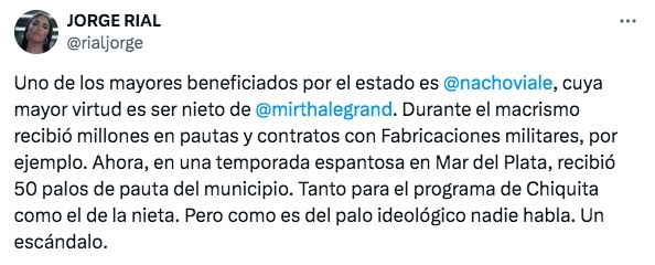 "Ahora, en una temporada espantosa en Mar del Plata, recibió 50 palos de pauta del municipio. Tanto para el programa de Chiquita como el de la nieta. Pero como es del palo ideológico nadie habla. Un escándalo", aseguró el periodista, dejando entrever los vínculos entre el nieto de Mirtha y el intendente del Pro, Guillermo Montenegro, del Partido de General Pueyrredón.