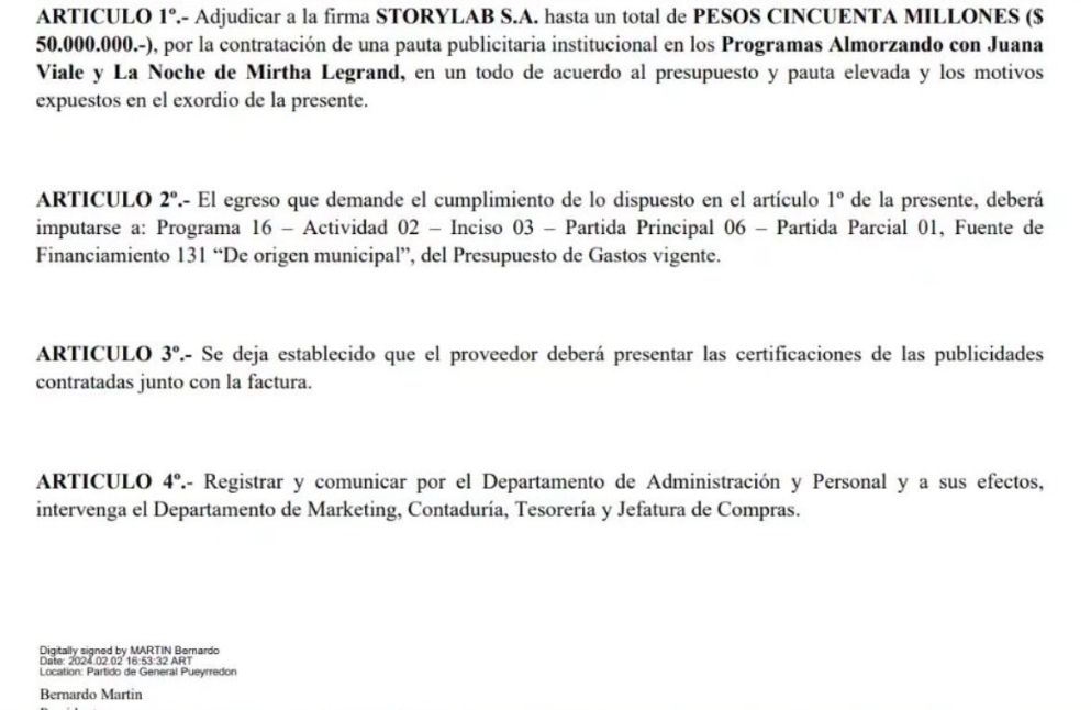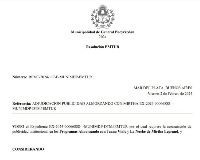 Allí se puede observar que ofrecieron un pago de 50 millones de pesos para ser mencionados en el ciclo de Mirtha y el de Juana Viale. Luego, señalan que al ser una pauta de carácter institucional, el dinero se obtendrá del presupuesto de gastos vigentes aprobado en el municipio. Lo firma Bernardo Martín, presidente del Ente Municipal de Turismo de Mar del Plata (EMTUR).