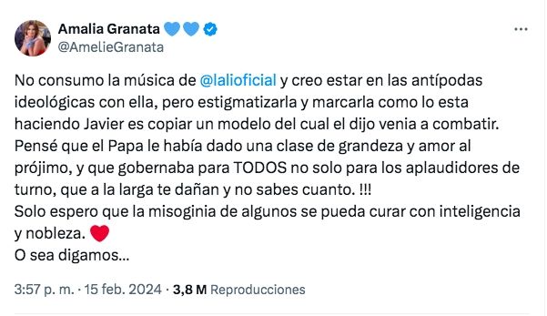 Ahora, quien se sumó a la polémica fue la diputada provincial Amalia Granata. La rosarina defendió a Lali y destrozó a Milei. "No consumo la música de @lalioficial y creo estar en las antípodas ideológicas con ella, pero estigmatizarla y marcarla como lo esta haciendo Javier es copiar un modelo del cual el dijo venia a combatir", expresó.