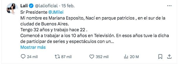 Recordemos que este jueves, Lali decidió compartir en su redes sociales un comunicado como respuesta al último ataque que recibió de parte del mandatario.