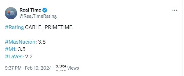 Luego, a medida que se fue desarrollando el programa, los niveles de audiencia fueron bajando. "¿La Ves?" quedó en 2.2, mientras que M1 escaló a 3.5 y "Más Nación" quedó al frente con 3.8 puntos de rating.