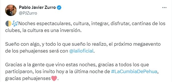 "Noches espectaculares, cultura, integrar, disfrutar, cantinas de los clubes, la cultura es una inversión. Gracias a la gente que vino estas noches, gracias a todos los que participaron, los invito hoy a la última noche de #LaCumbiaDePehua, gracias pehuajenses", agregó el intendente.